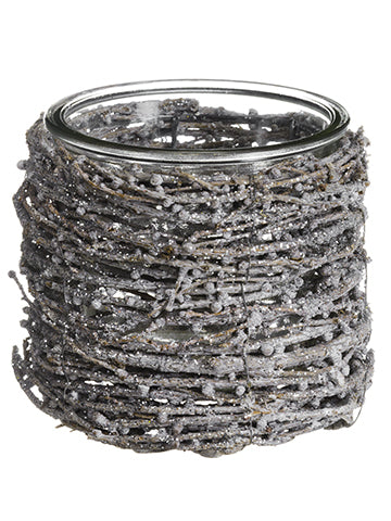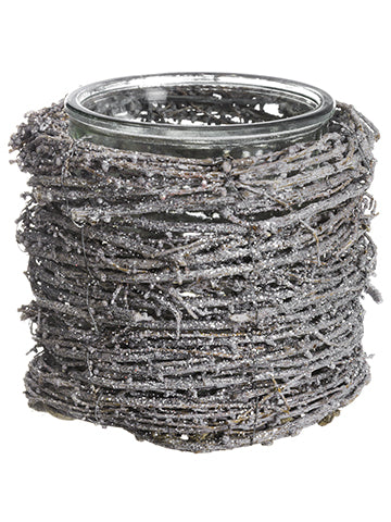 Glittered Twig Candleholder With Glass Brown Silver