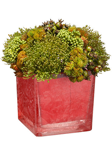 Sedum/Berry Arrangement in Glass Vase Green Burgundy