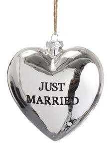 5" Just Married Glass Heart Ornament Antique Silver (pack of 6)